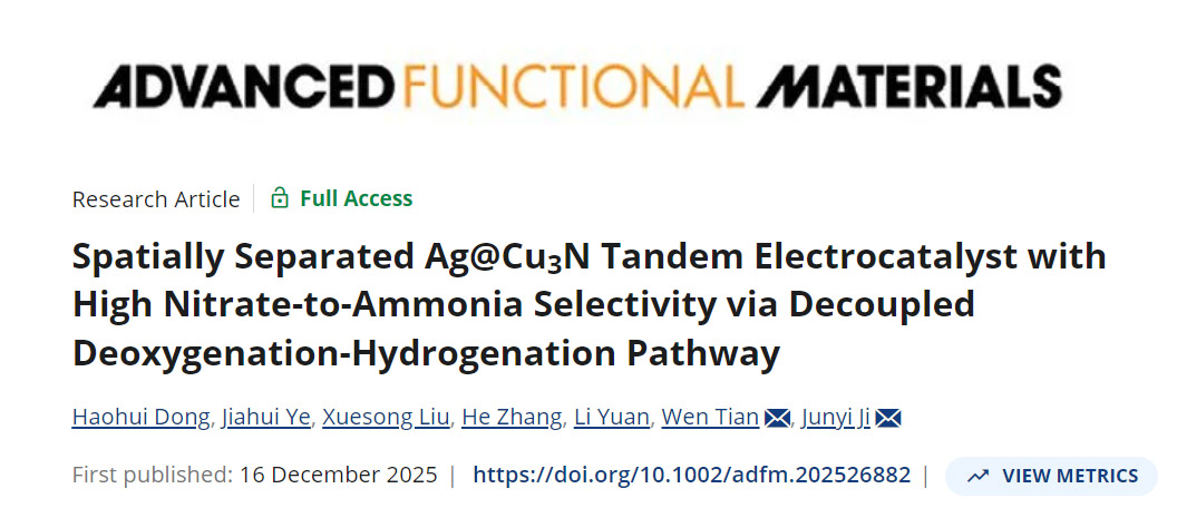 吉俊懿教授团队在《Advanced Functional Materials》期刊发表了关于硝酸根还原高性能串联电催化剂设计的研究论文“Spatially Separated Ag@Cu3N Tandem Electrocatalyst with High Nitrate-to-Ammonia Selectivity via Decoupled Deoxygenation-Hydrogenation Pathway”。硕士研究生董浩辉为论文第一作者,吉俊懿教授和田文高级实验师为论文共同通讯作者,成人网址