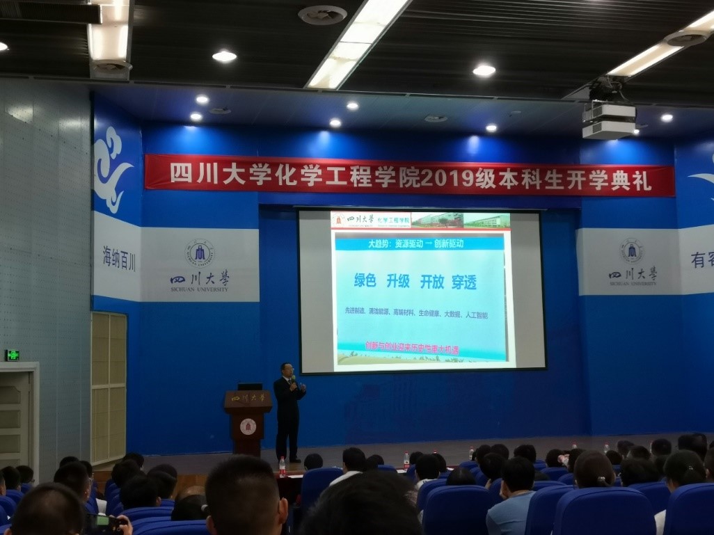 2019级本科新生开学典礼在江安校区水上报告厅顺利举行。学院党委书记庞国伟,党委副书记、纪委书记李天友、党委副书记姜利寒,副院长唐盛伟,学院教授委员会副主任王辛龙,化学工程系系主任袁绍军,过程装备与安全工程系系主任伍勇,制药与生物工程系系主任李德富,冶金工程系系主任黄青松,工程实验教学中心主任蒋炜,学生教导员李川娜,新生班主任吕松、鲍泽威、韩怀志、吉华、谭帅、袁绍军、陈建钧、易美桂、吉旭、黄青松、张永奎、王雅博、周加贝,岳海荣、王冰、司振兵等教师代表出席了本次开学典礼。开学典礼由姜利寒副书记主持。