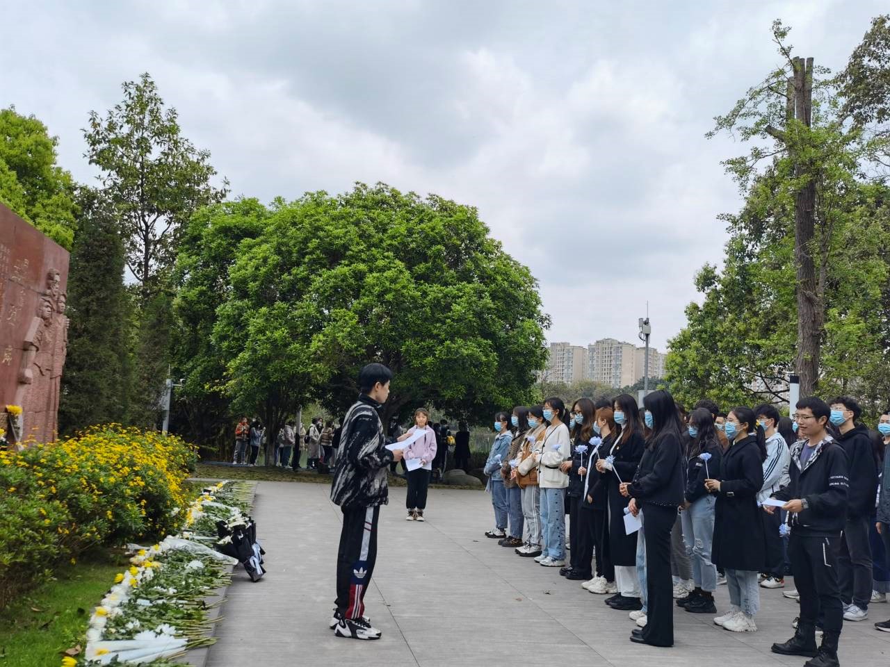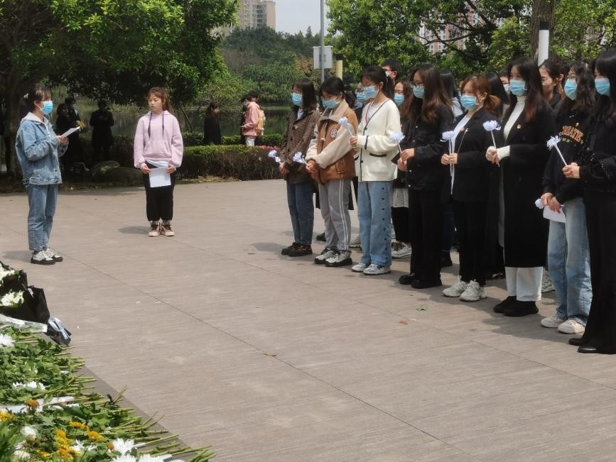 在明远湖畔,英烈碑前,气氛庄重又肃穆,碑下早已摆满了菊花,所有人都自发地在碑前列队。习新会指导老师雷金凤首先上前发表致辞,此次清明祭拜活动旨在歌颂先烈们无比坚定的信仰和英勇卓绝的气概,从而激励同学们矢志不渝牢记并发扬先烈精神,在新时代为祖国的建设不懈奋斗、建言献策。