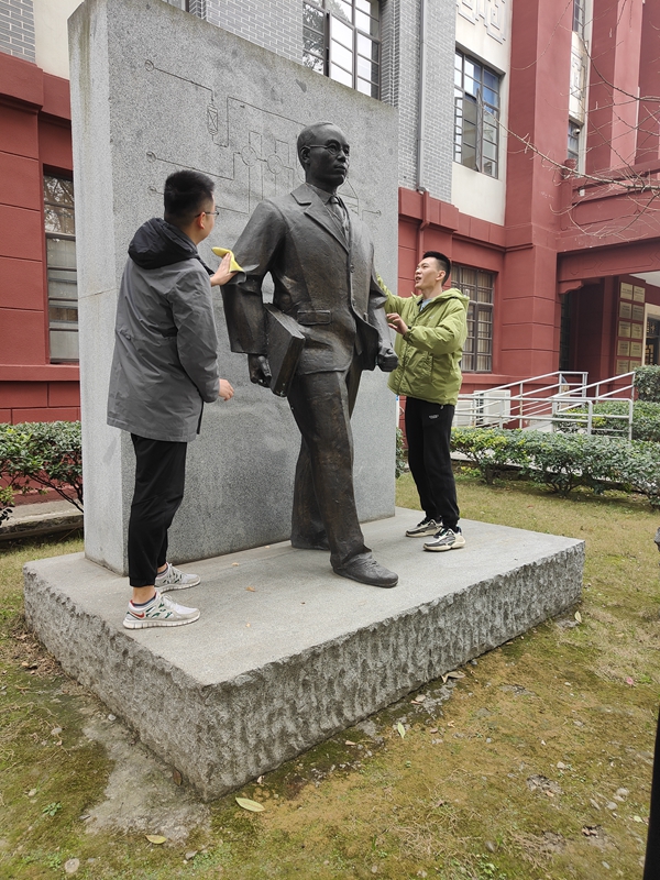 支部同志擦拭张洪沅先生铜像