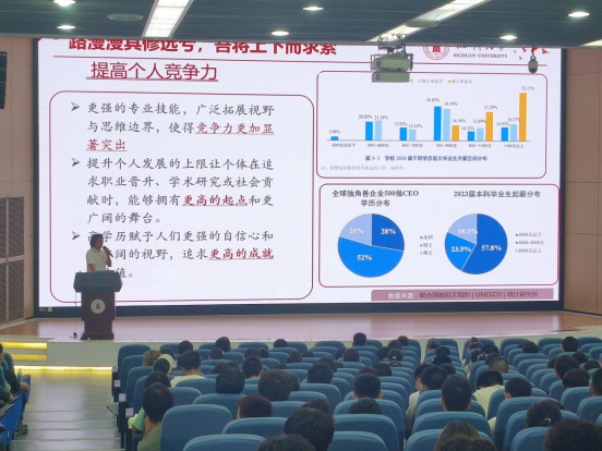 首先,刘秋里从大学与高中的不同之处切入,指出进入大学后人生规划路径的多样性。他从减轻就业压力、培养符合国家发展需求的高层次人才、提高个人竞争力等方面深入阐释了提倡深造的原因,指出本科毕业后继续学习对于获取更扎实的知识积累与储备、养成终生学习的能力、拓展更广阔的人生舞台、实现更高的社会价值都具有重要意义。他鼓励同学们提早规划自己的大学学习生活,树立学业发展目标,提升个人综合竞争力。
