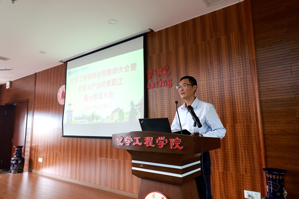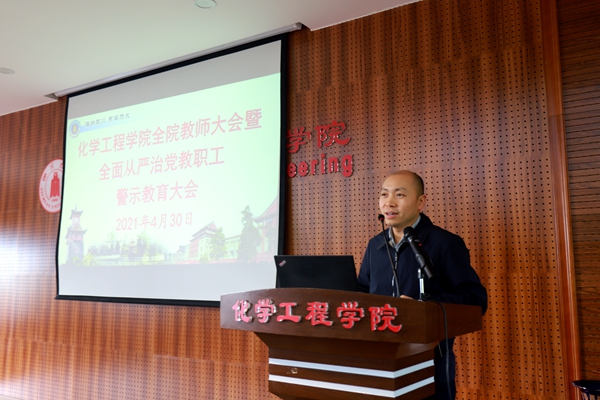 最后,学院党委书记进行总结。他说到,今天的警示教育大会从财经政策、师德师风、学术诚信和安全管理等几个方面进行了教育提醒。希望学院全体教职员工能够以习近平新时代中国特色社会主义思想为指导,牢记高校立德树人使命,将党史学习教育与一流化工学科建设相结合、与一流化工创新人才培养相结合、与一流科技成果产出相结合,划定高校教师行为的红线和底线,强化对权力运行的制约和监督,为坚决打赢疫情防控阻击战,奋力推进中国特色、川大风格的世界一流大学建设和一流化工学科建设提供坚强保障。